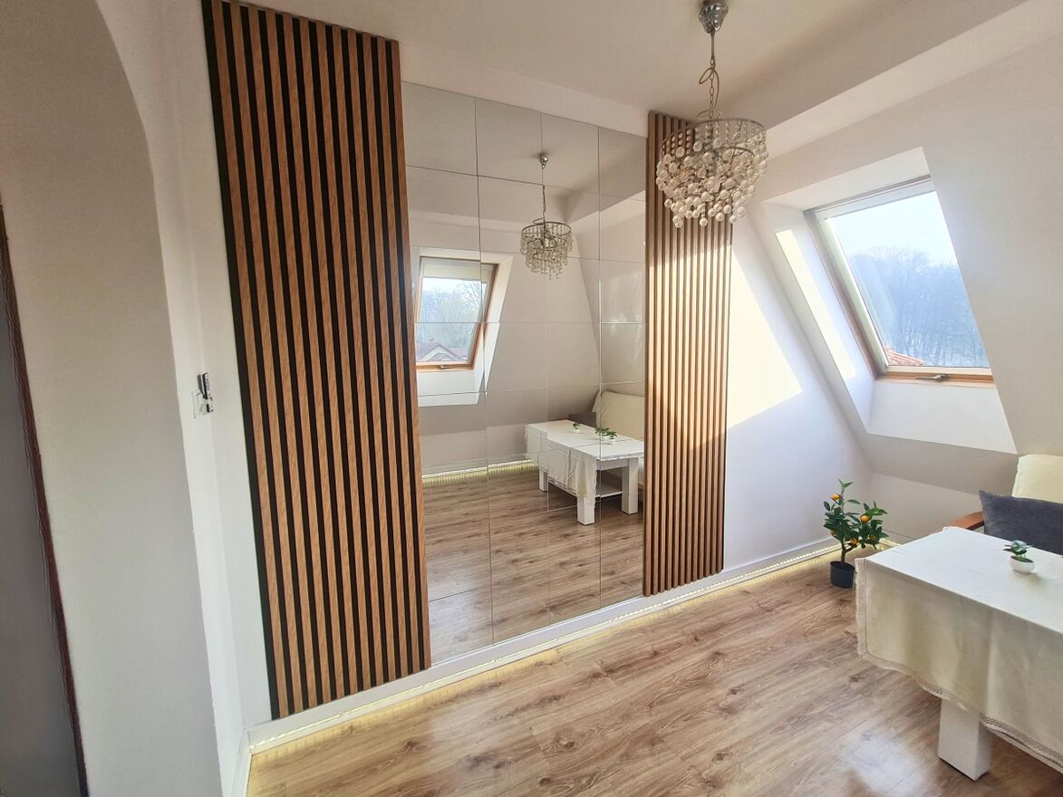 1 pokój: 11,80m (na zdjęciach z lamelami i lustrami) - dobrze doświetlony, użytkowany w formie salonu lub pokoju do pracy. Otwarte przejście do kuchni.