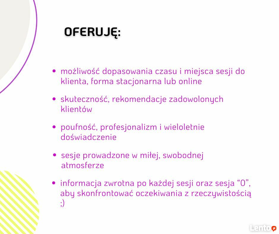 Oferuję miłą i komfortową atmosferę, wspieranie zamiast oceniania i duże doświadczenie w pracy z ludźmi. Jeśli chodzi o więcej informacji odnośnie mojego doświadczenia i mojej oferty, zapraszam serdecznie na stronę internetową: www.strengthofpersonality.pl