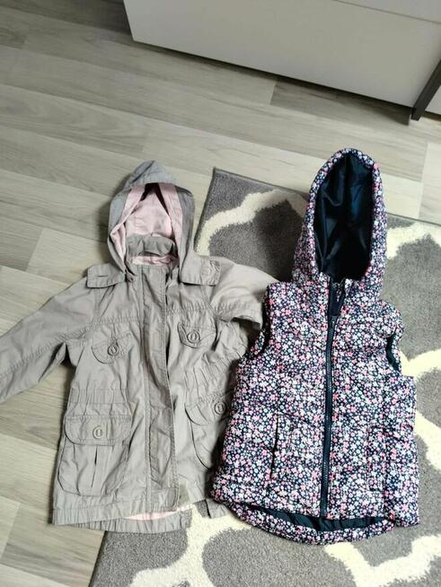 Nowoczesna kamizelka ocieplana w kolorze różowym oraz kurtka dziecięca w rozmiarze 98 akazmiezelka 104 w bardzo dobrym ...