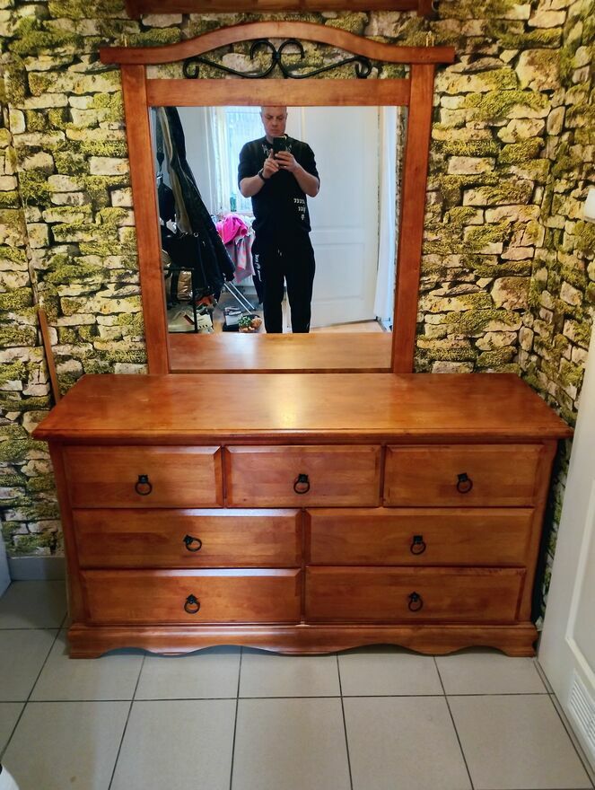 Sprzedam drewnianą komodę z lustrem stan określam jako bardzo dobry mebel wykonany jest z drewna wysokość komody 78cm, długość 145cm, szerokość 45 cm, posiada 7 szuflad o głębokości 10 cm.lustro wysokość 117cm szerokość 88cm lustro i komoda jest kompletem ale istnieje możliwość rozdzielenia,sprzedaj jako komplet cena 350zlTel 504 - pokaż numer telefonu -