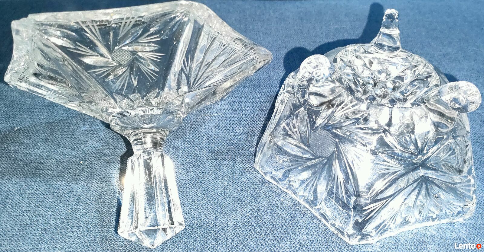 Sprzedam elegancki zestaw 5 elementów wykonanych z grubego, tłoczonego szkła.Wszystkie są w bardzo dobrym stanie – bez wyszczerbień, pęknięć ani zmatowień.