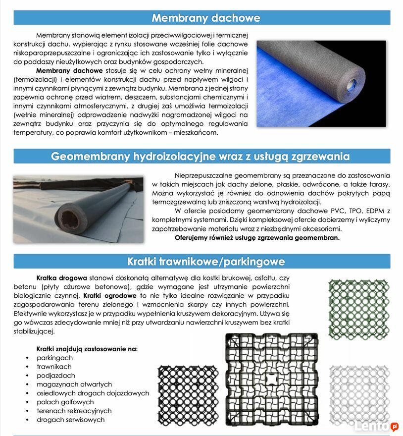 Firma ZA-KU od lat dostarcza wyspecjalizowane materiały budowlane dla klientów z Polski oraz kontrahentów zagranicznych. W swojej ofercie posiadamy inne membrany, folie, geowłókniny, geokraty - produkty wysokiej jakości i w konkurencyjnej cenie od czołowych polskich producentów. Zachęcamy do zapoznania się z naszymi pozostałymi ogłoszeniami.