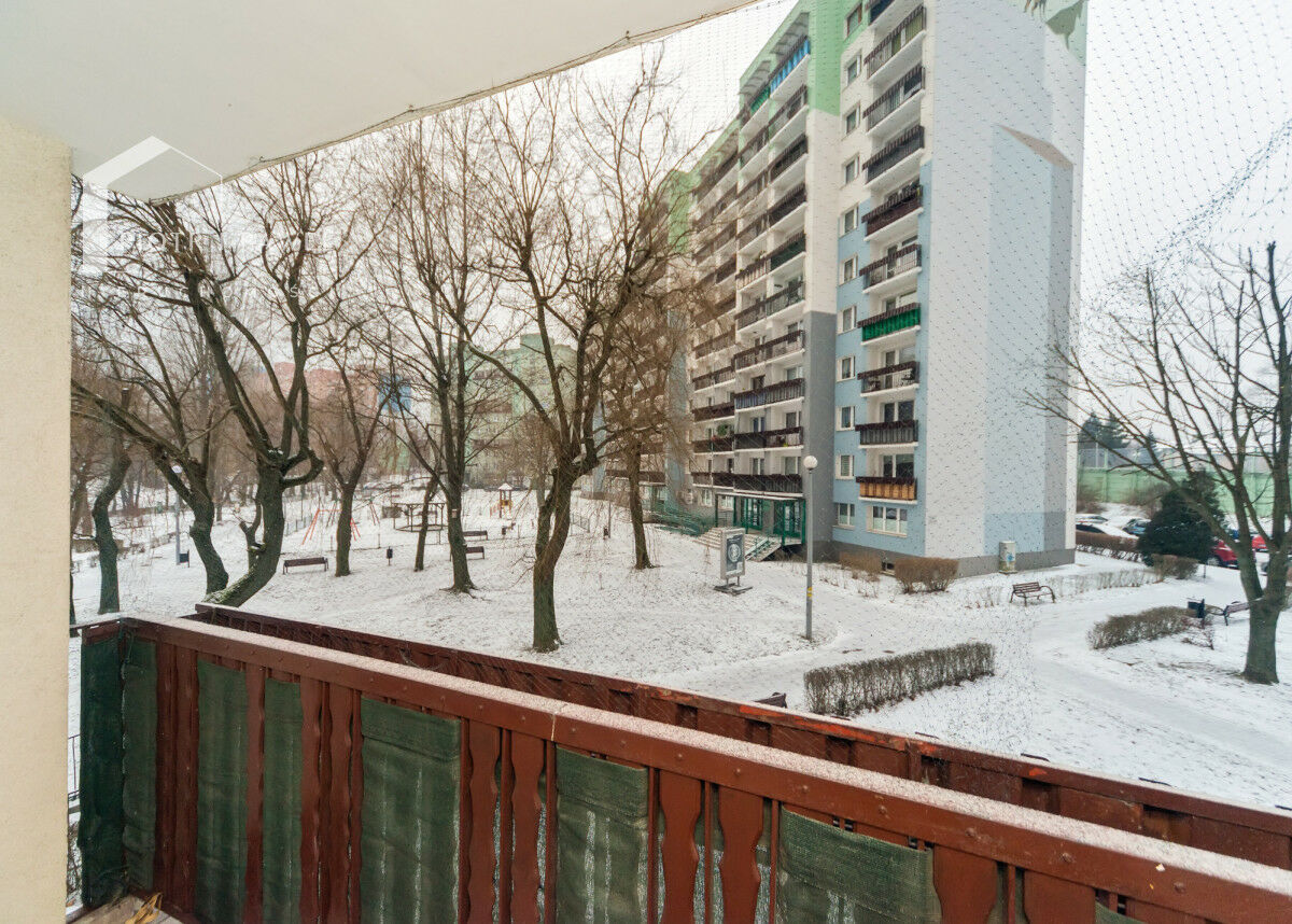 balkon z widokiem na park osiedlowy - dużo zieleni i drzew