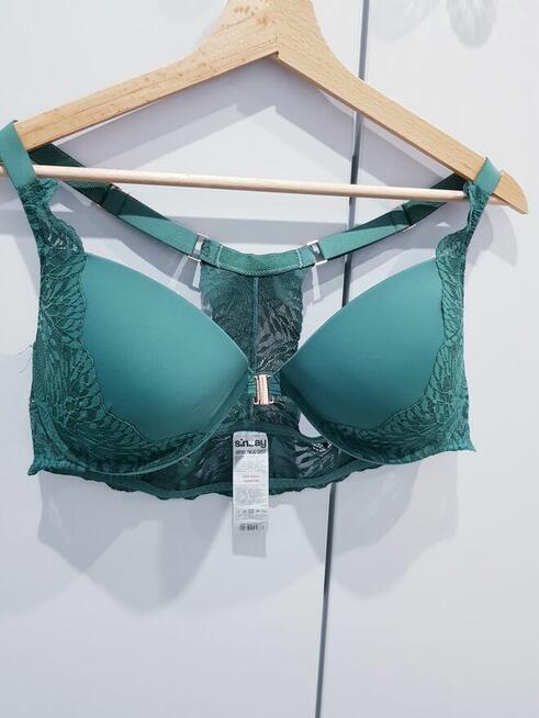 Przedmiotem sprzedaży jest założony dosłownie 3 razy damski biustonosz w przepięknym kolorze butelkowej zieleni marki ...