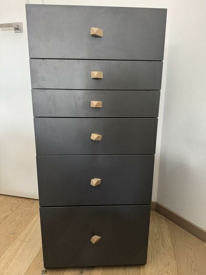 Sprzedam używaną komodę (słupek) marki VOX z serii Spot. Nowoczesny design, grafitowy kolor, charakterystyczne drewniane uchwyty. Mebel bardzo pojemny i ustawny.Wymiary: 103 x 45 x 46 cm.
