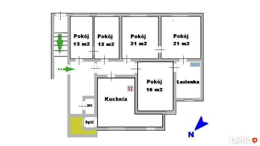 Mieszkanie czesciowo umeblowane i wyposażone o pow. 126m2 składające się z dużego przedpokoju, dużej kuchni ze spiżarką, małej służbówki oraz aneksem jadalnym. Mieszkanie posiada dużą sypialnie, duży pokój dzinny. Łazienka z wanną i umywalką oraz pralką. Osobne WC. Dodatkowym atutem jest pomieszczenie, do którego jest osobne wejście z przedpokoju- przeznaczenie to pokój, gabinet, garderoba.